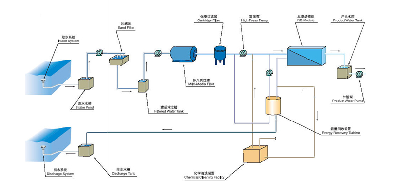 海水淡化設備工藝給水預處理是保證反滲透系統能夠長期穩定運行的關鍵,在制定海水預處理方案時應充分考慮到海水中存在大量微生物、細菌和藻類等雜質。微生物的生長不僅會給取水設施帶來許多麻煩,而且會直接影響海水淡化設備及海水淡化工程的正常運轉。周期性漲潮、退潮,海水中夾帶大量泥沙,濁度變化較大,易造成海水預處理系統運轉不穩定。海水具有較大腐蝕性,對系統中所采用的設備、閥門、管道件的材質要作一定篩選,耐腐性能要好。
