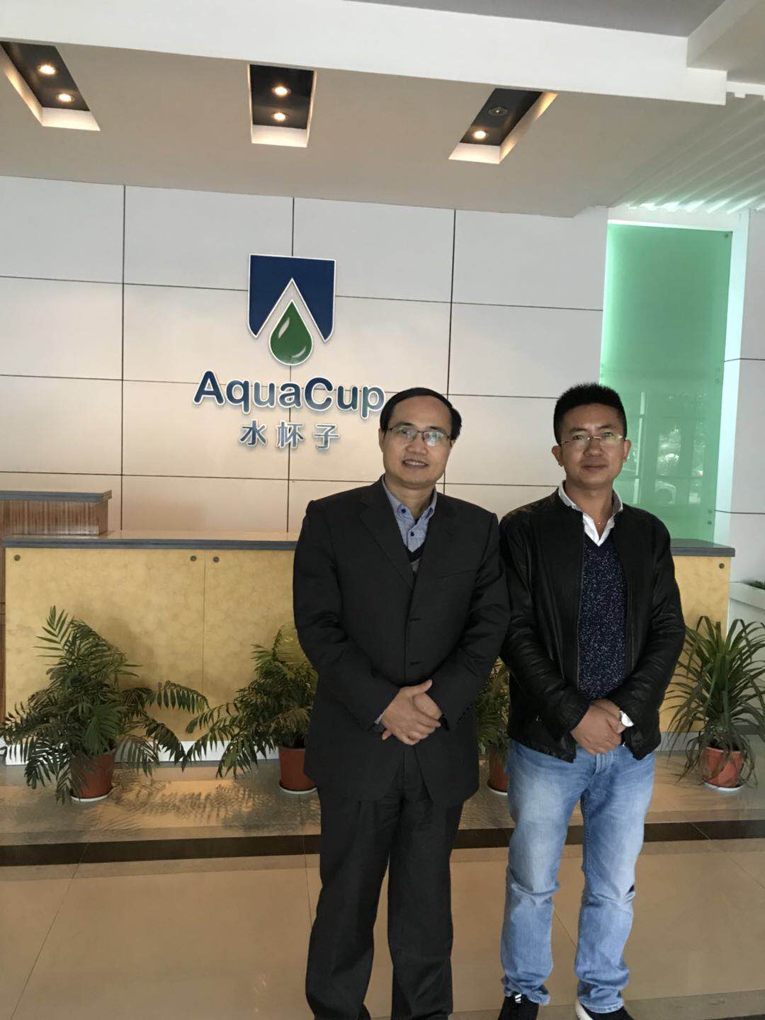 我司經(jīng)理代文根先生(右邊)與南京水杯子科技股份有限公司龍?jiān)屏枷壬ㄗ筮叄╊I(lǐng)導(dǎo)合影。