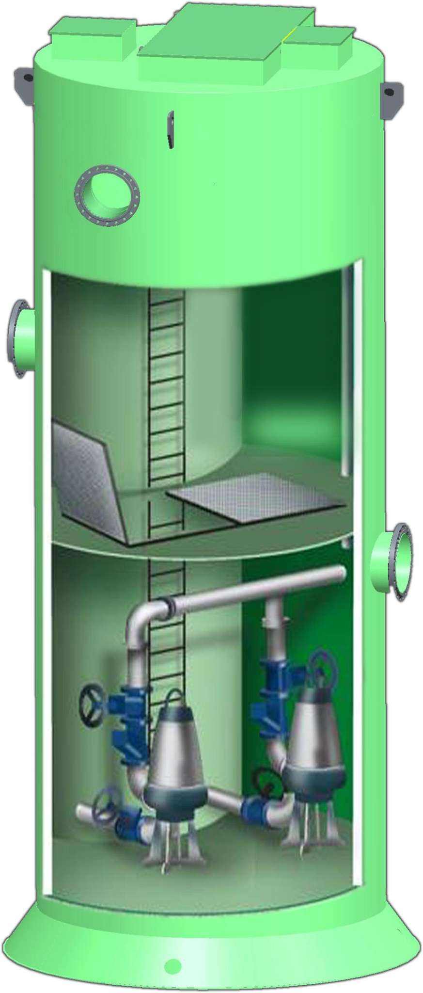 預制泵站作為一體化設備,成套提供:泵站筒體、壓力管道、檢修平臺、檢修爬梯、格柵裝置、耦合系統、通風裝置、防滑井蓋等。